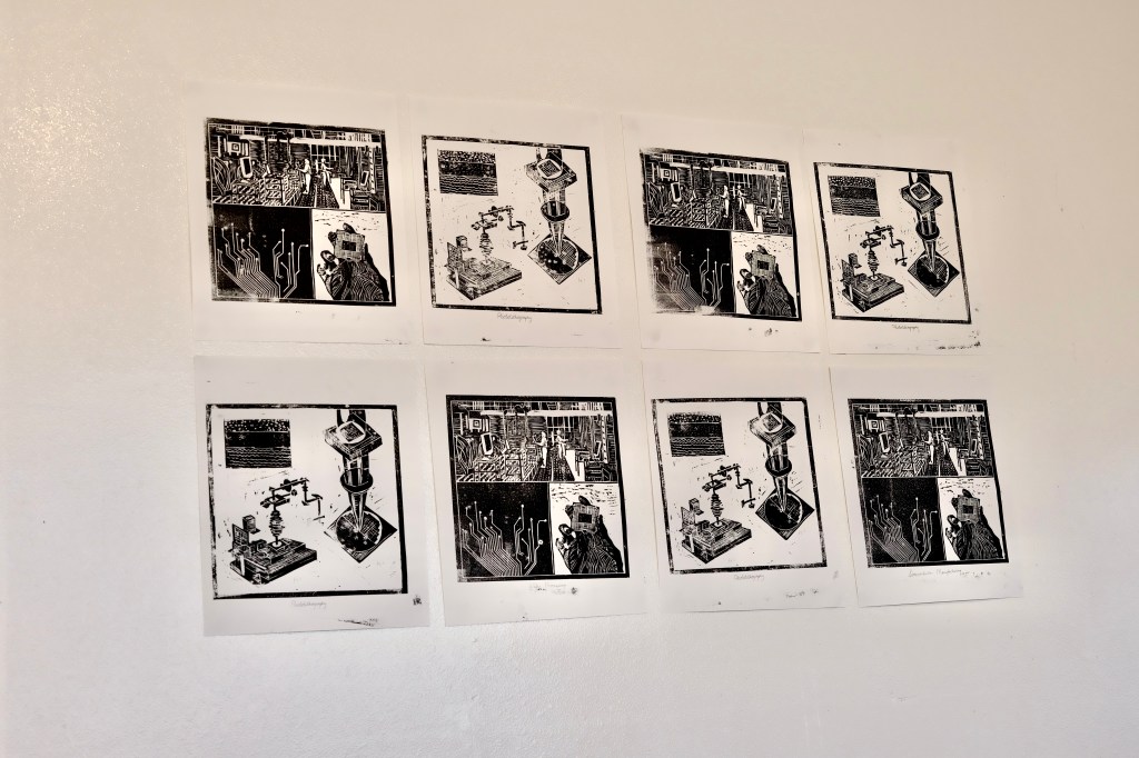 This printmaking project derived from research into historical and contemporary infrastructure of semiconductor chip manufacturing. Juxtaposing lino-cuts and photolithography, a component of chip manufacture that led to increased reproducibility and standardization, it investigates the role of craft and handwork in industrial-scale fabrication systems and in processes of discovery.